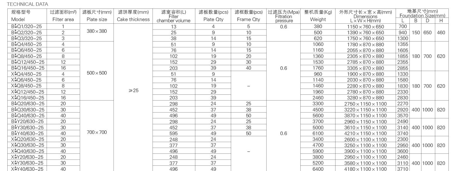 According to the cake discharging method, cast iron filter presses have an automatic type and a manual type. Because of the difference from the PP filter press plate, the cast iron filter plate is very heavy and not easy to move by manpower, so normally, if the filter plate size is over 630mm, we will recommend the automatic cast iron filter press to save labor. And there are two plate types for different filtering demands: chamber type and plate & frame filter plates. Normally, a cast iron filter press adopts motor-driven hydraulic closing to get a better clamping effect.