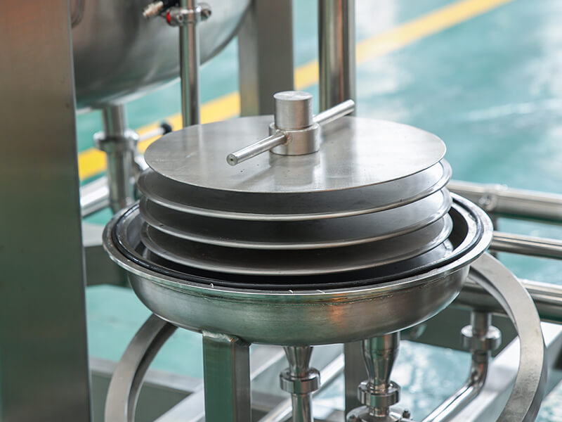 The cone-shaped filter disc used in this machine is placed horizontally and can support itself. Its high-strength double-sided stainless steel wire filter screen has a flat and smooth surface, is strong and reliable, and has a long life. The supporting cone disc adopts a rib-type structure. It is helpful to achieve the hygienic requirements of stable filtration and cleaning of liquids. In order to achieve safe filtration and hygienic requirements for liquids, liquid filtration is carried out in fully enclosed high-quality stainless steel polished containers and sanitary piping systems; a diverter plate is set at the inlet of the filtrate to make the liquid flowing in a vortex state in the pipeline, through splitting and slowing down, laminar flow is gradually formed to ensure uniform pre-coating of each filter disc and stable filter layer formation.