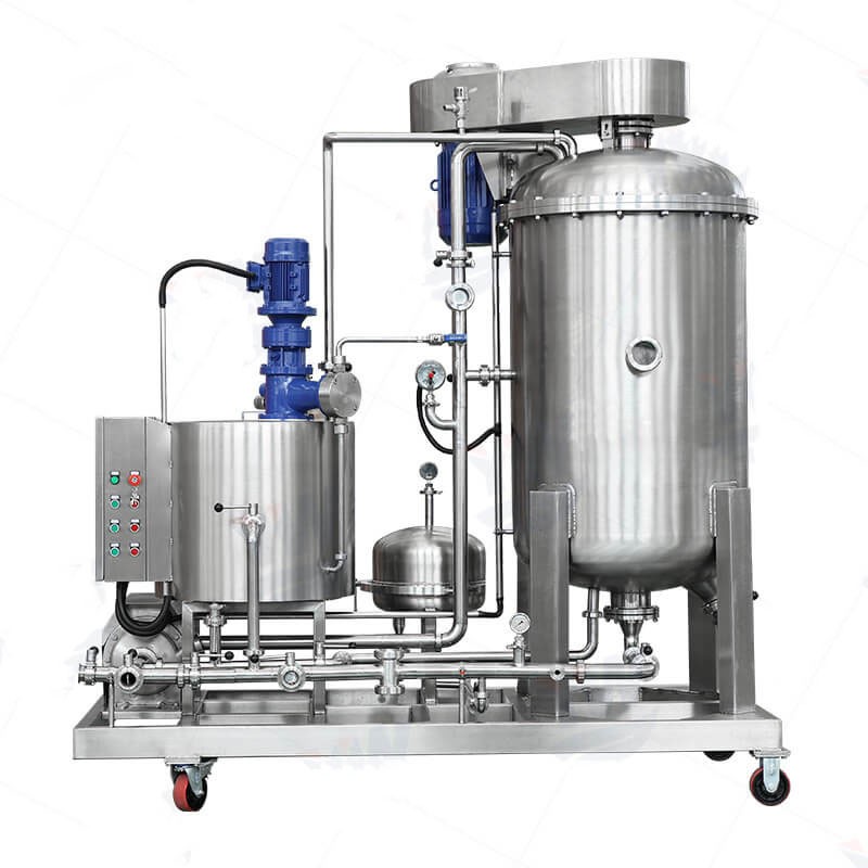 The filtrate to be filtrate passes through the action of the centrifugal pump and the diatomite mixture quantitatively output by the metering pump, and enters the filter tank through the pipeline, and is filtered by the diatomite or other filter aids on the filter plate, and the yeast and other large particles are removed. Some larger fungi, solid particles and impurities are separated, and the filtered clear liquid is discharged.