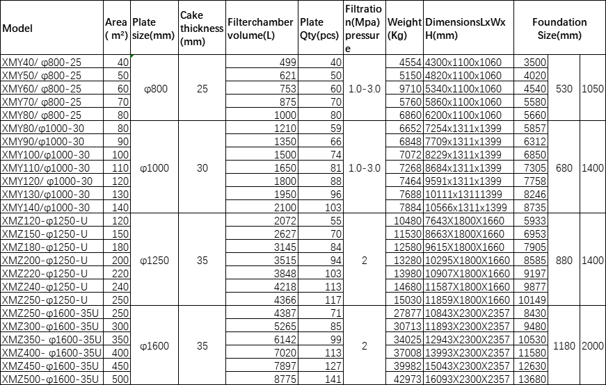 The filtration pressure ranges from 1MPa to 2.5MPa.