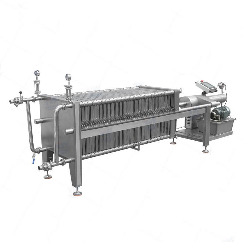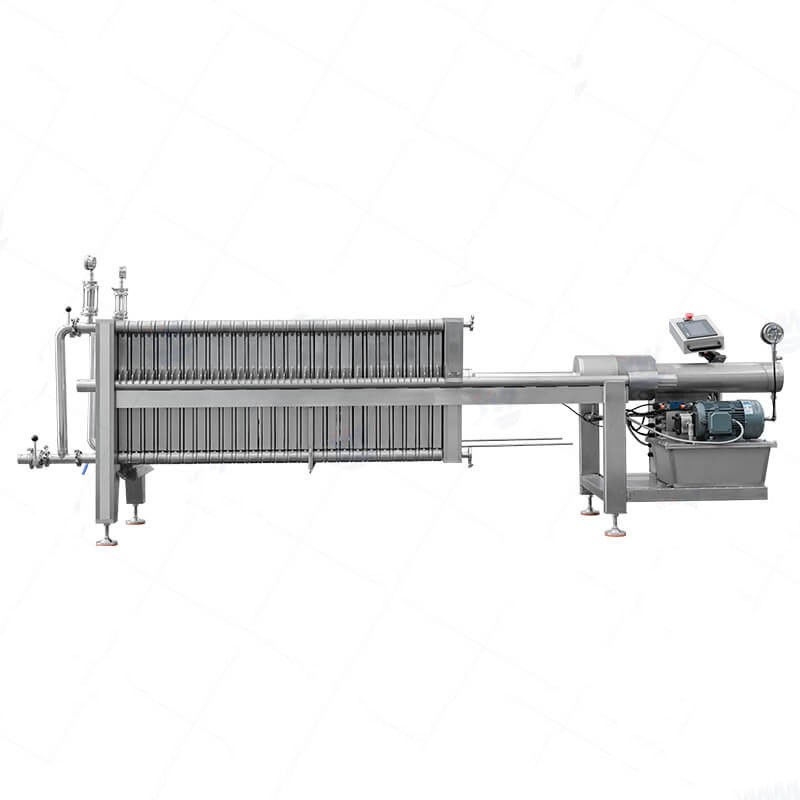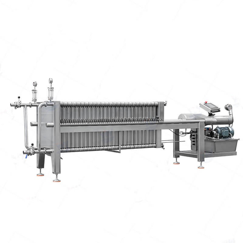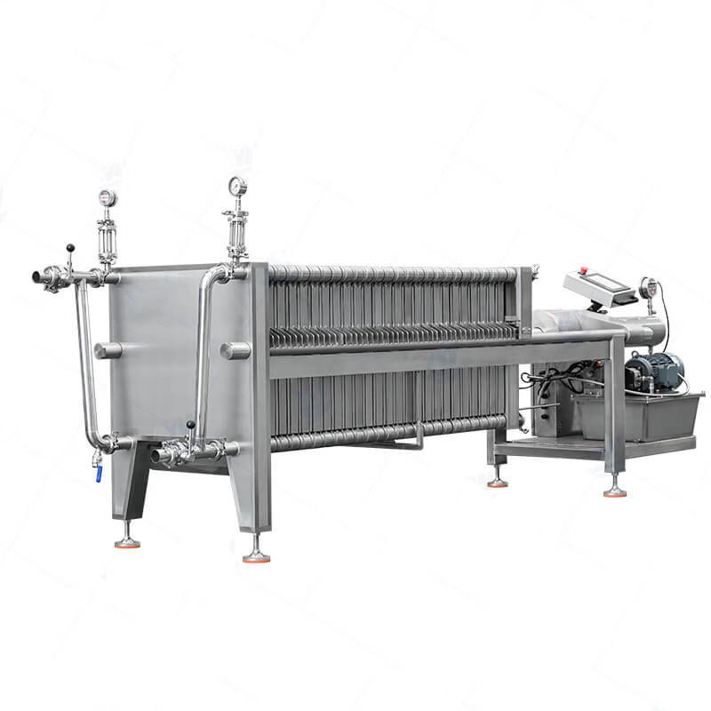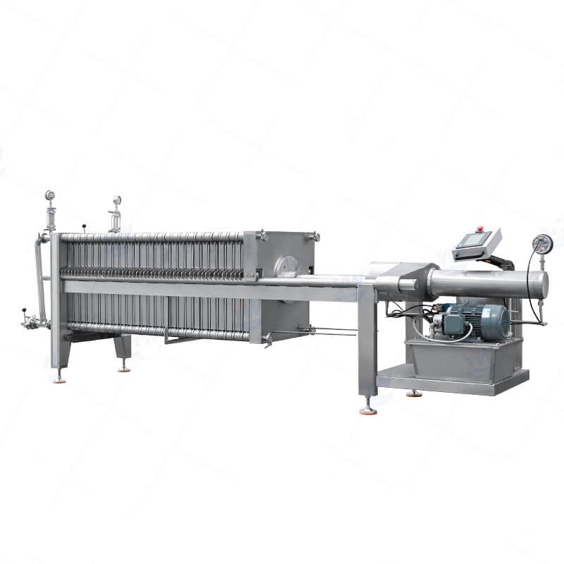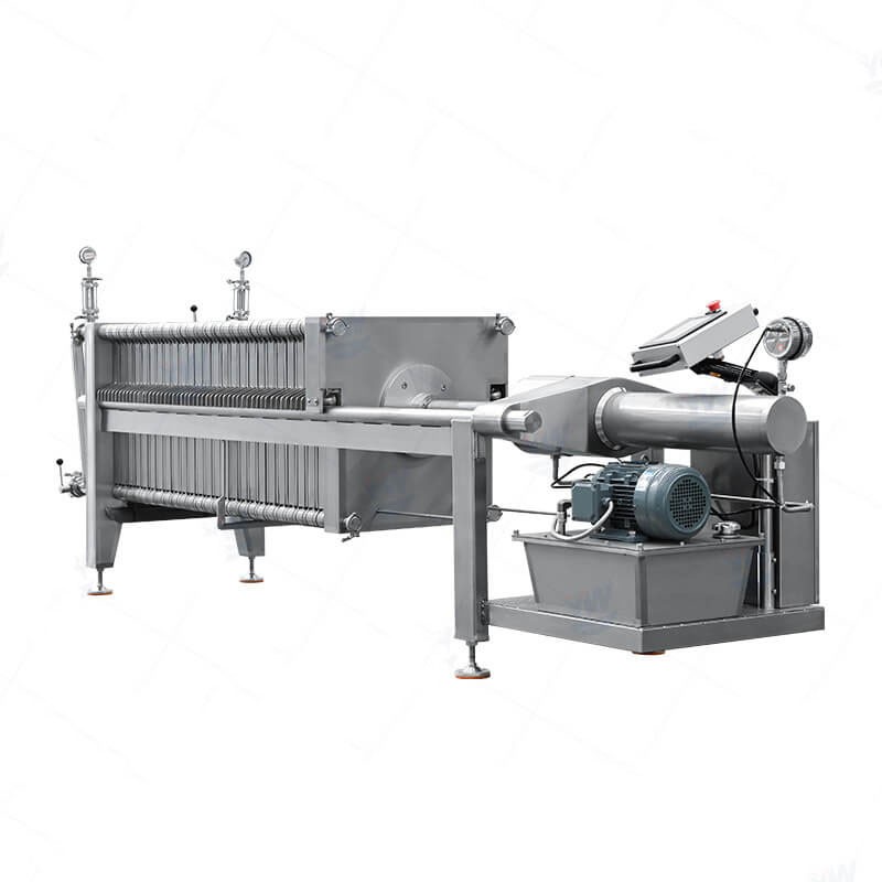This type of filter press made of stainless steel material, with all contact parts being of food-grade quality. There is a hydraulic system that uses high pressure to close all plates and frames properly.
